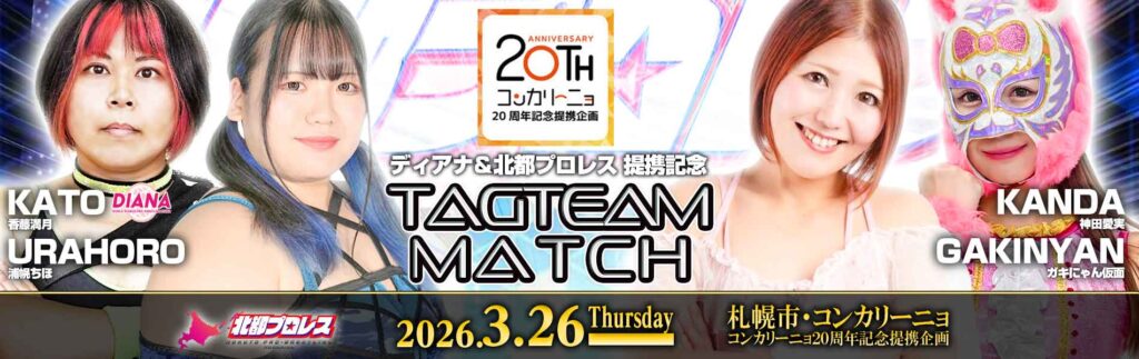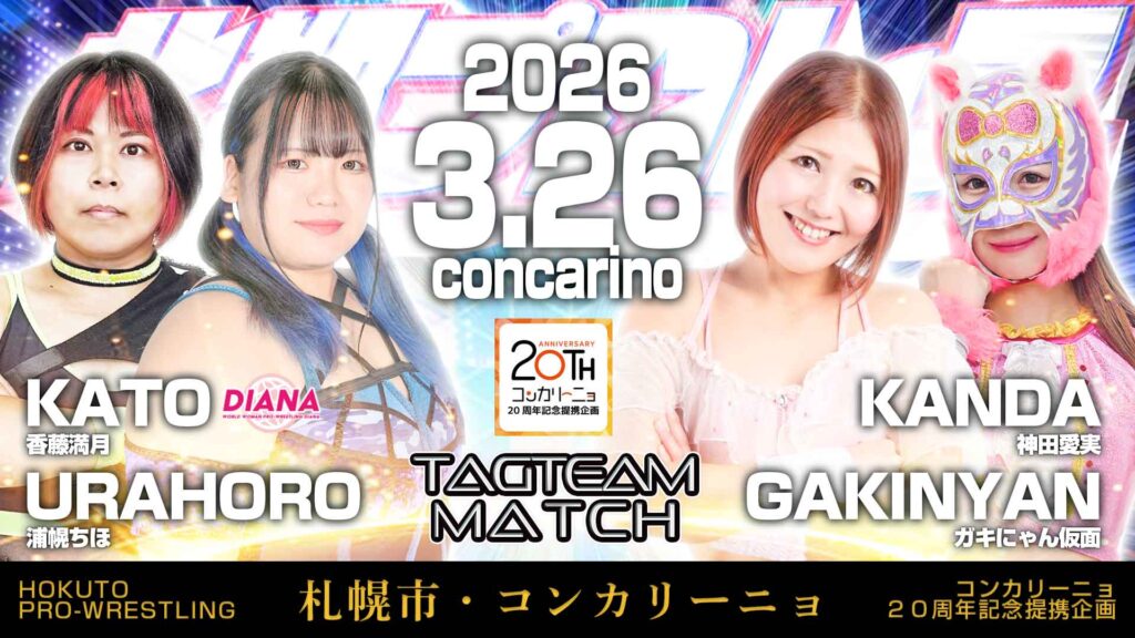 ディアナでプロレス留学を行う浦幌ちほ選手が、ディアナ・香藤満月選手とタッグ結成。神田愛実選手、ガキにゃん仮面選手と激突します!皆様の応援をよろしくお願いします。